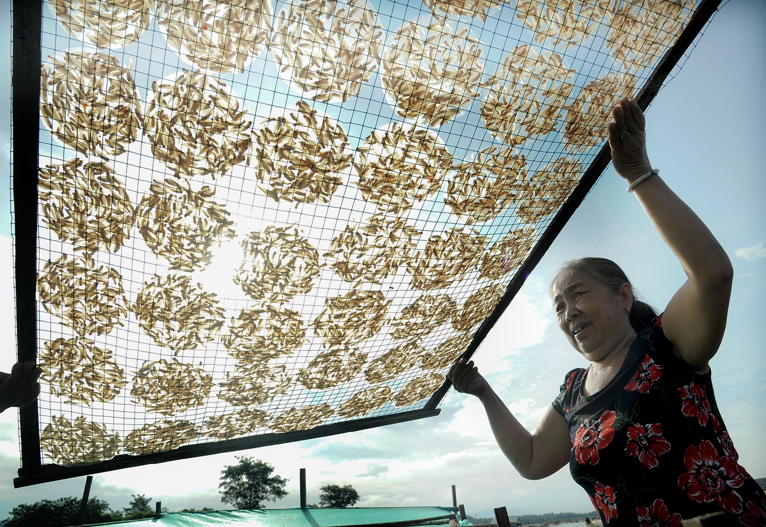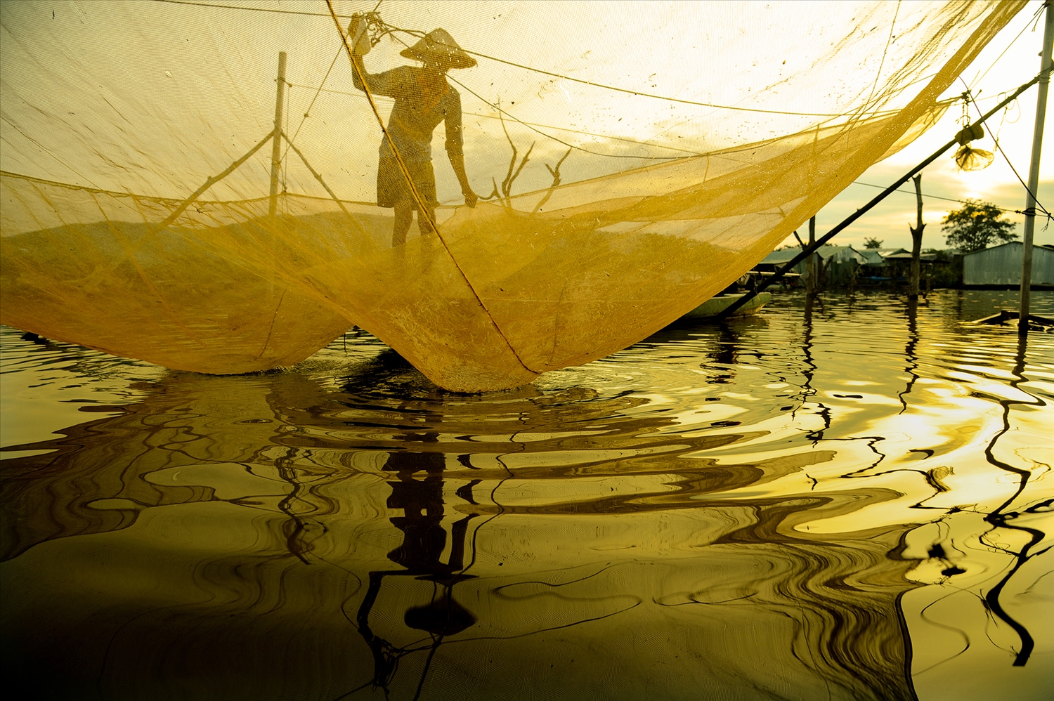 Thu rớ (vó bè) trong ánh bình minh