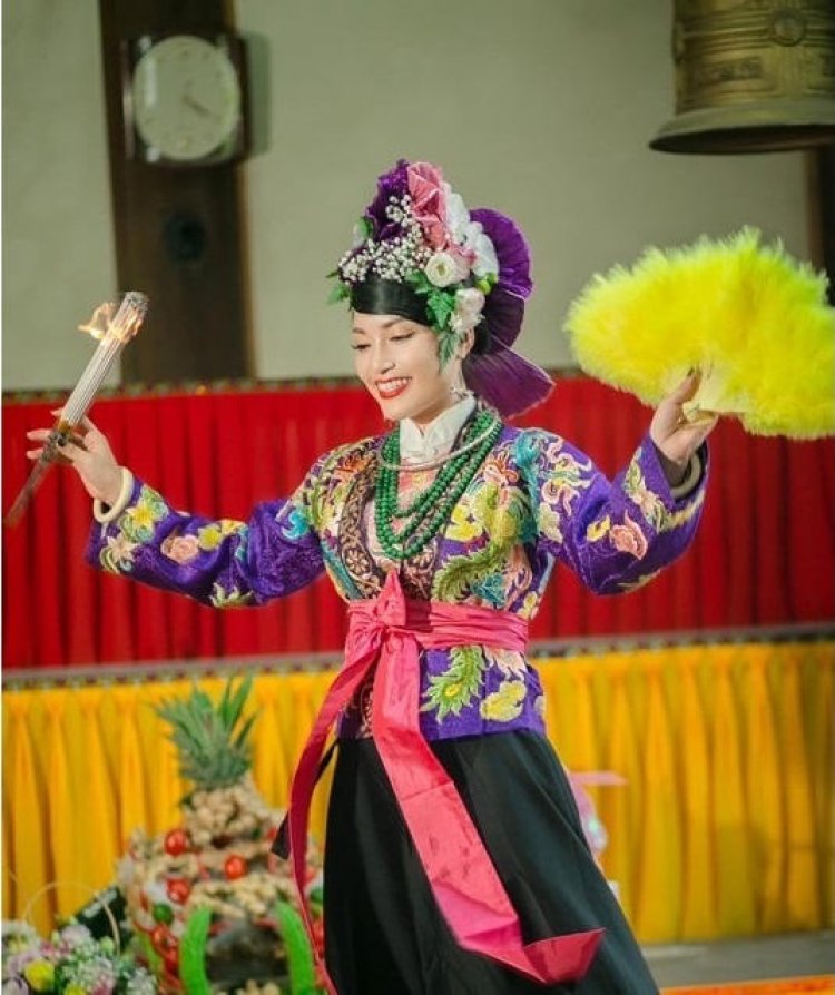 Cô Bé Lục Cung khi loan giá ngự đồng thường mặc áo lam hoặc áo tím chàm (ngắn vạt rộng tay). Cô ngự đồng khai cuông rồi múa mồi như các tiên cô trên Thượng Ngàn khác.