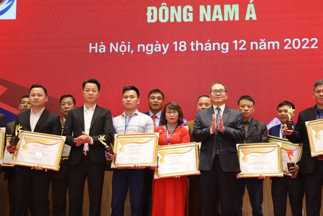 Ông Phạm Văn Thăng – Viện trưởng Viện Nghiên cứu bảo tồn và phát triển Văn hóa Đông Nam Á cùng GS.TS. Bùi Minh Trung trao tặng kỷ niệm chương cho các nghệ nhân và đơn vị có thành tích xuất sắc trong gìn giữ và bảo tồn văn hóa