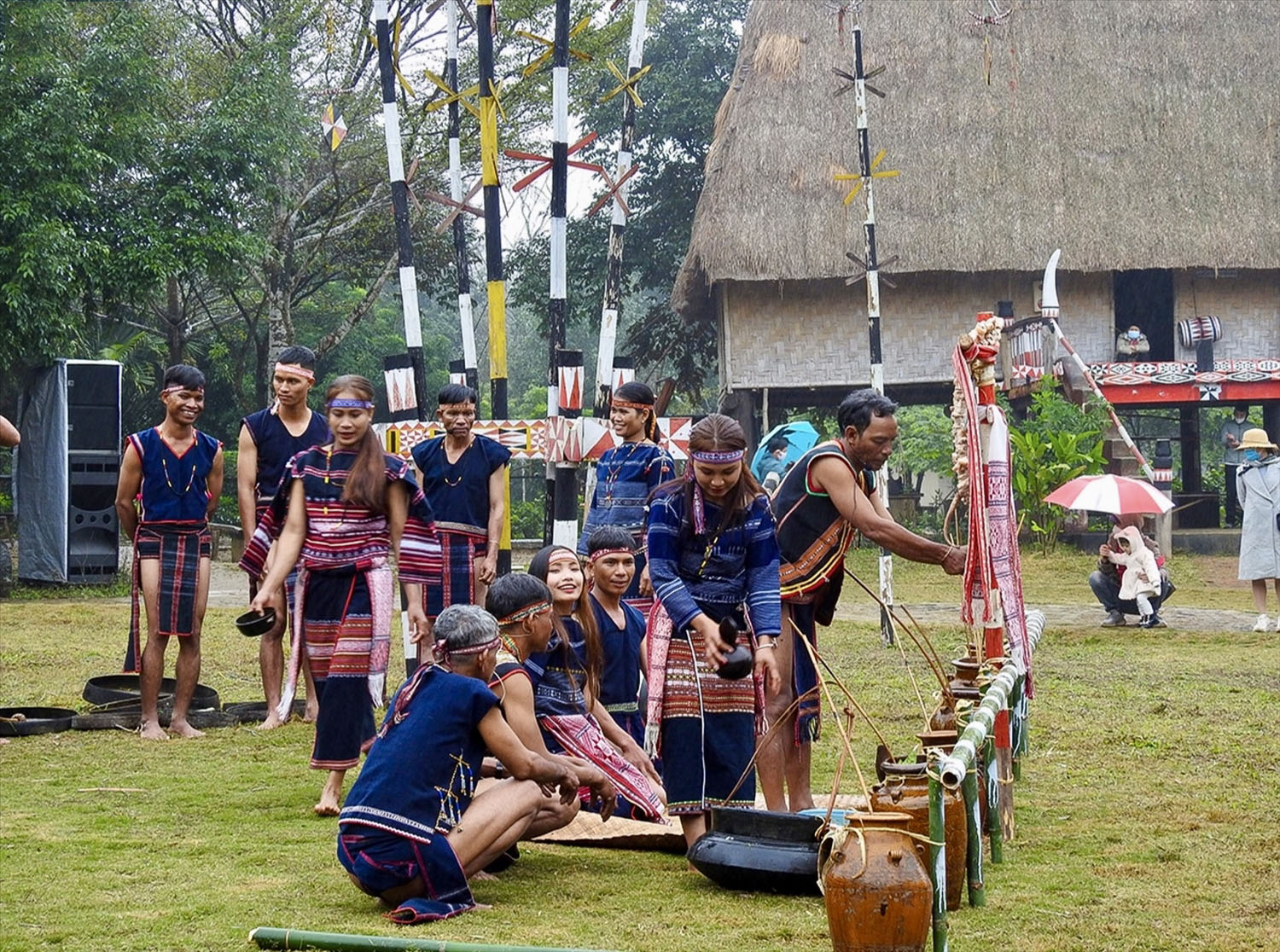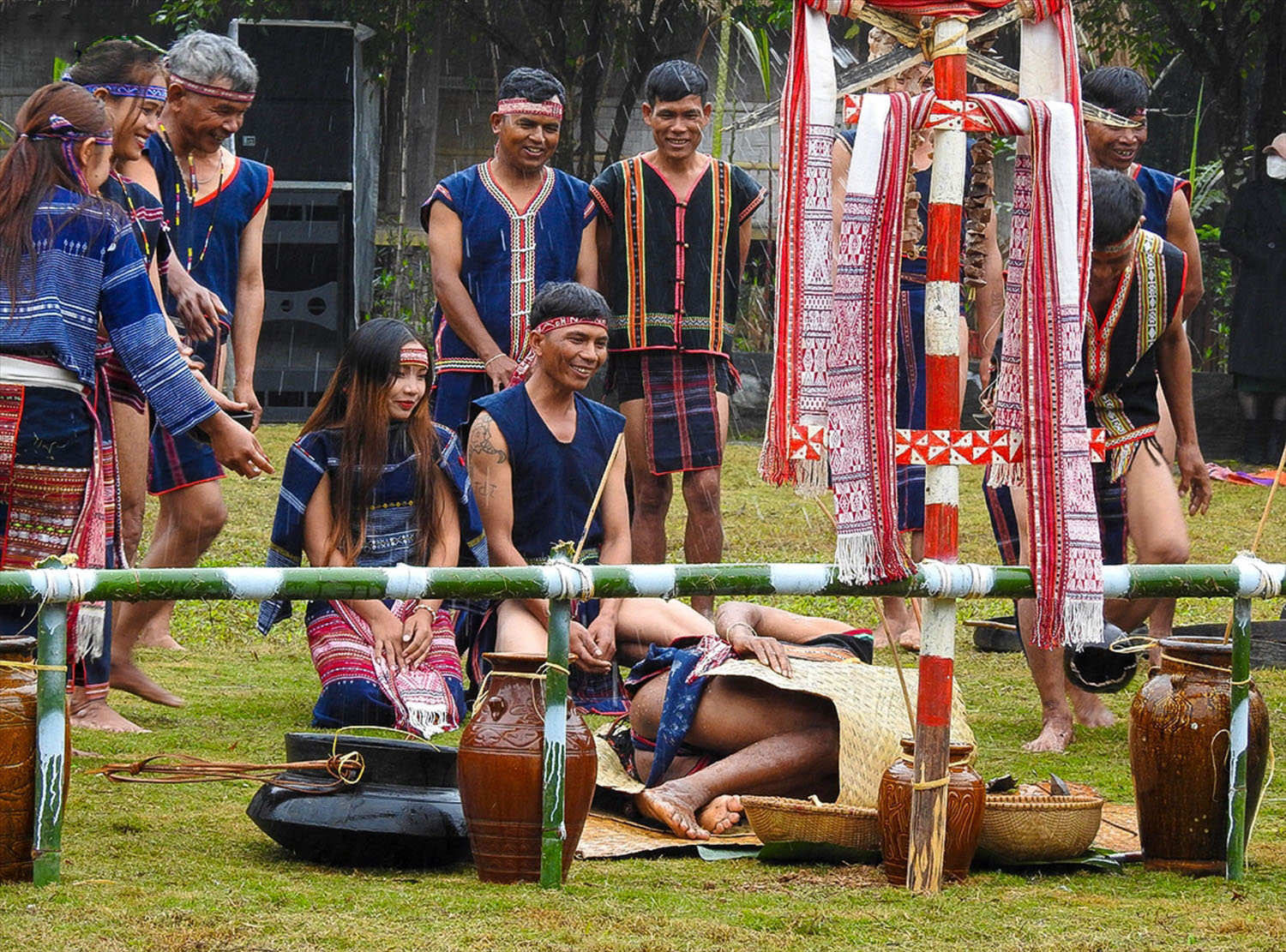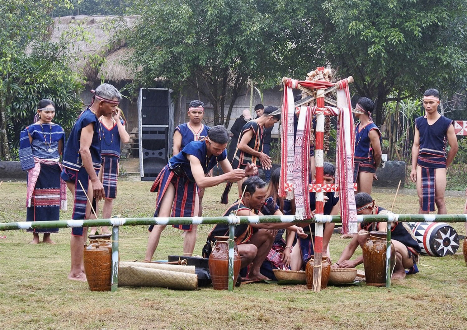 Trong không khí trang nghiêm, trước sự chứng kiến của dân làng và gia đình 2 họ, người đại diện sẽ làm lễ khấn báo với thần bản mệnh của cộng đồng. Họ sẽ lấy tiết gà bôi lên đầu cô dâu và chú rể. Tiếp đến là ông mối sẽ cầm tay có đeo vòng của cô dâu và chú rể chạm vào nhau. Ông sẽ yêu cầu đôi tân lang, tân nương ăn chung 1 cái đùi gà, một miếng gan gà, uống chung 1 chén rượu cúng. Sau đó già làng và ông mối chúc phúc cho đôi tân hôn
