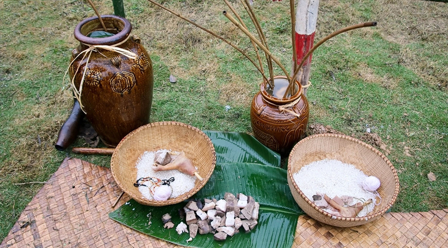 Vật phẩm trong lễ cưới bao gồm: một ché rượu cần, một con gà với bộ gan được luộc chín và một đĩa tiết sống
