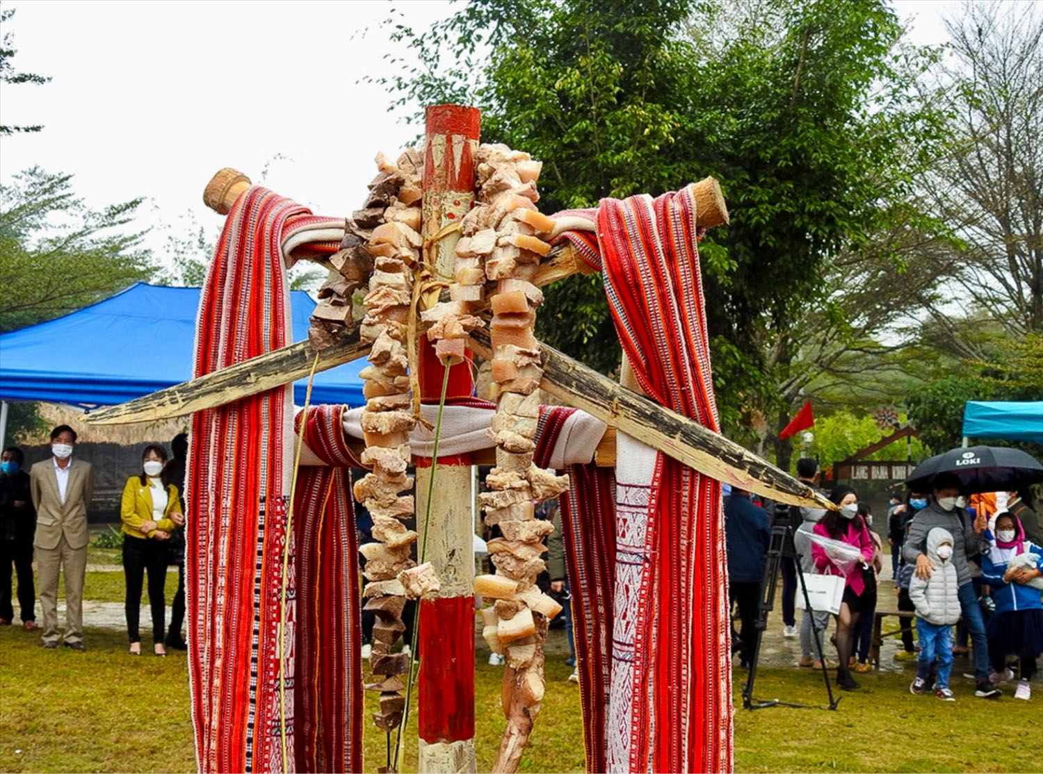 Thịt được luộc chín, xâu thành dây thịt treo trên cây cột làm lễ vật trong đám cưới của người Ba Na