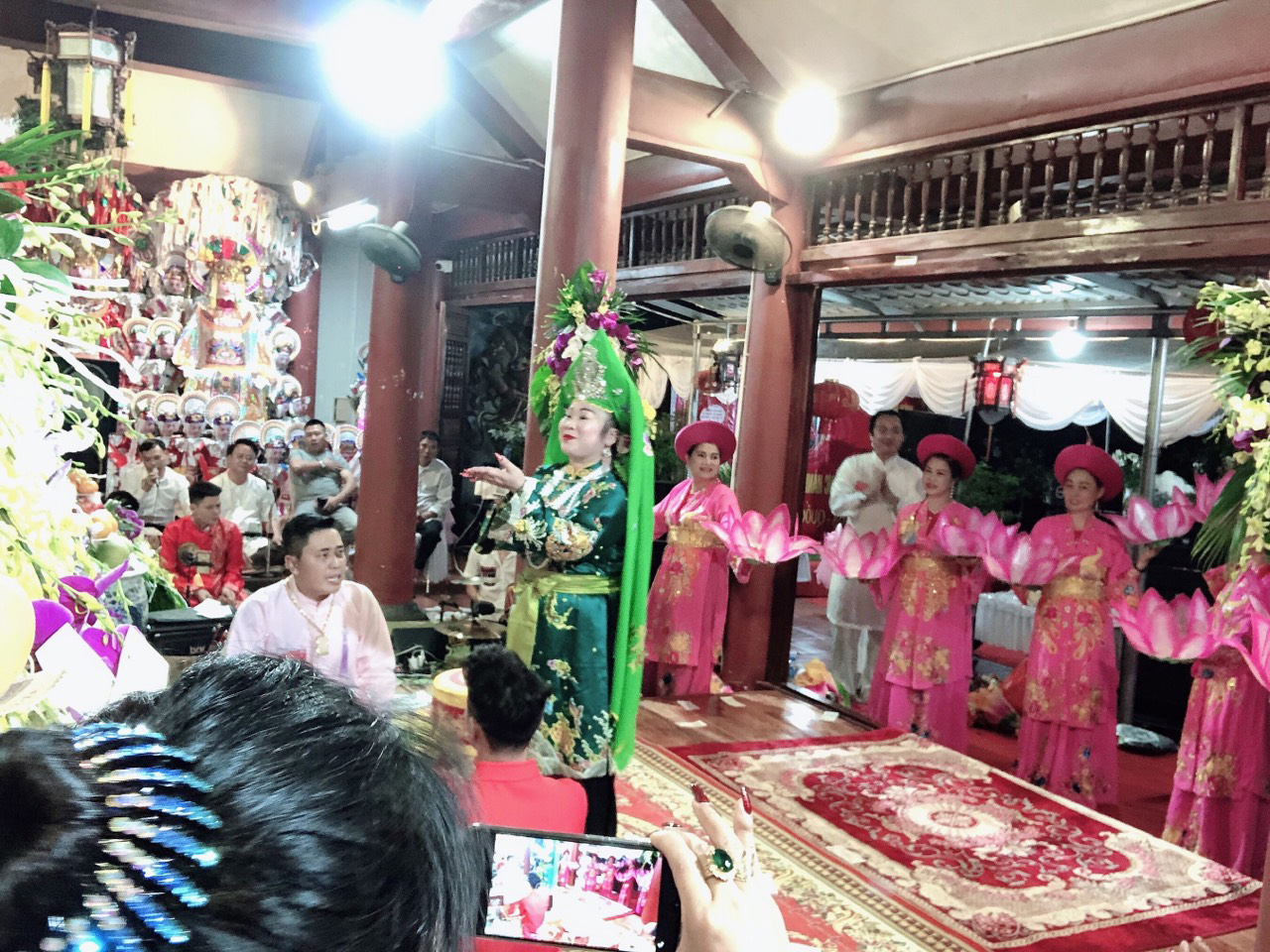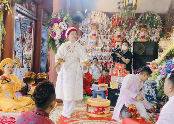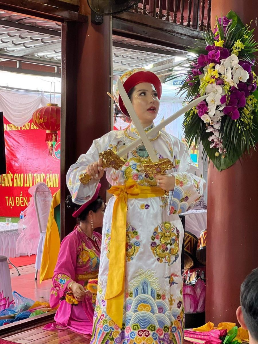 Đồng thầy Đinh Thị Nhung thực hành nghi lễ hầu đồng khai hội