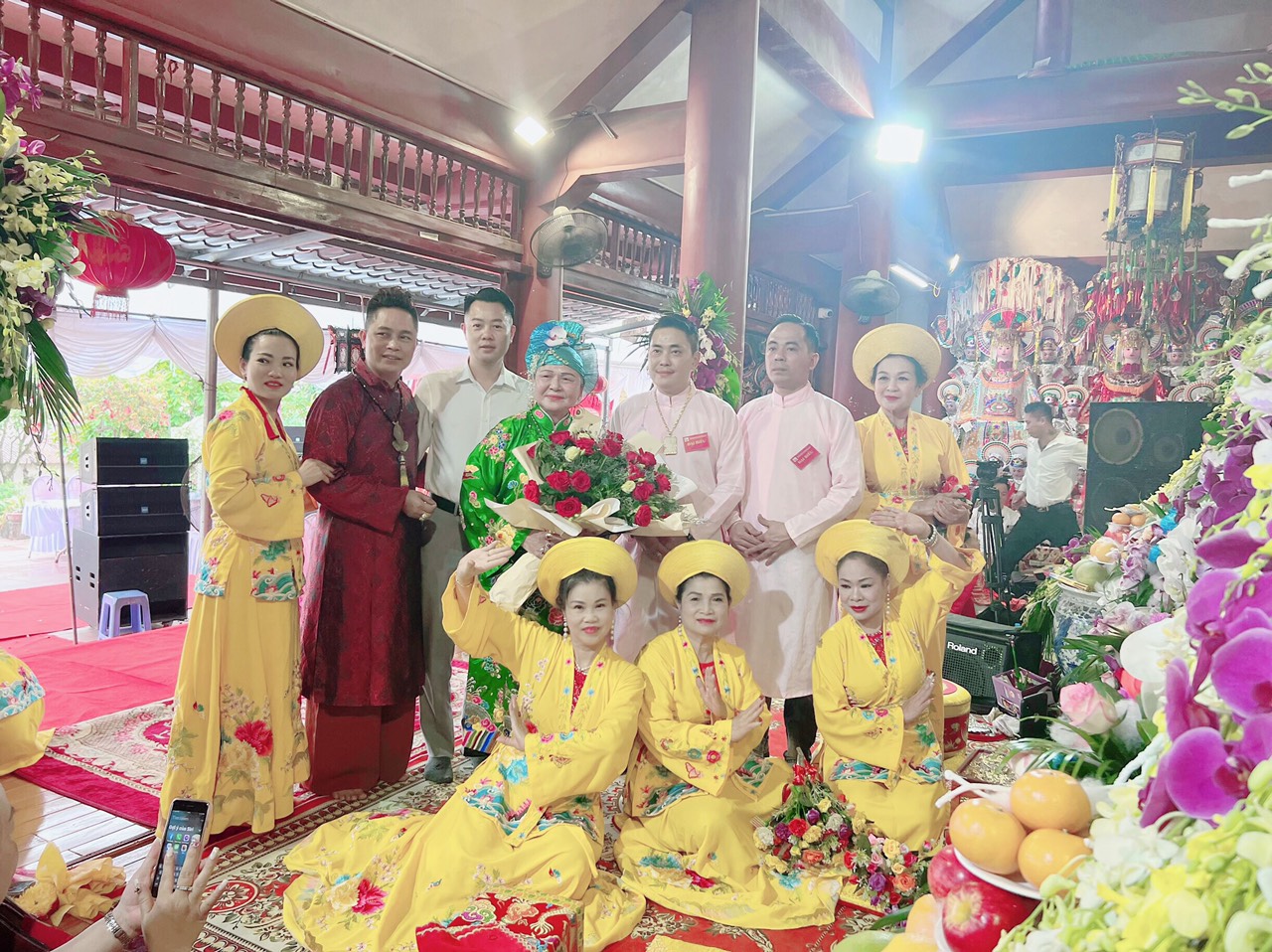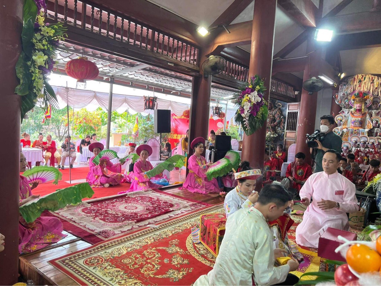 Ông Phạm Văn Thăng (Viện trưởng) và bà Nguyễn Thị Thanh Hương (Phó Viện trưởng) Viện Nghiên cứu Bảo tồn và Phát triển Văn hóa Đông Nam Á chụp ảnh lưu niệm cùng các thanh đồng sau buổi giao lưu thực hành tín ngưỡng thờ Mẫu Tam phủ