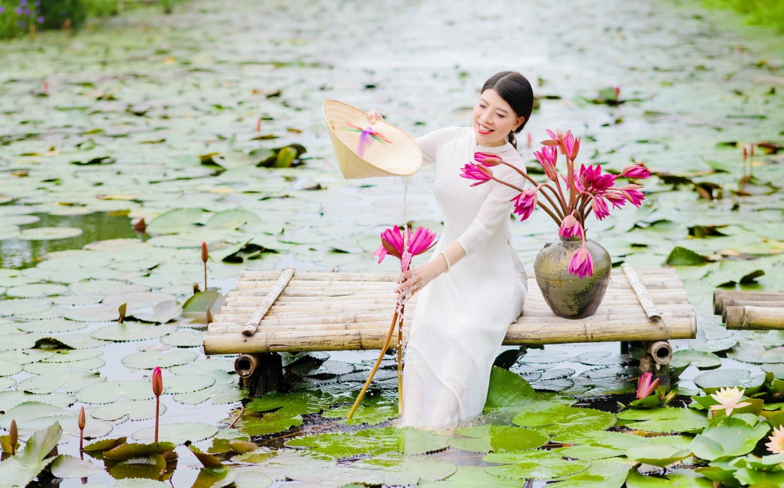 Một bến thuyền hoa súng đỏ bông