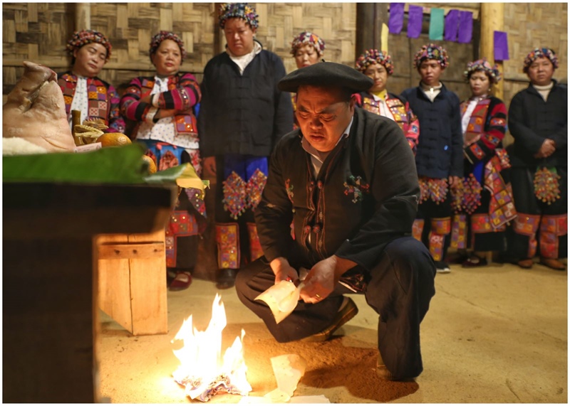 Giữa sân, gia chủ đốt một đống lửa lớn và thầy cúng thưa với tổ tiên về việc “con cháu dâng lễ vật phẩm, tiền, vàng để tiễn đưa tổ tiên trở về trời; xin tổ tiên nhận lễ vật do con cháu trong dòng họ dâng lên, người dẫn đường đã có, tổ tiên hãy về trời và hãy phù hộ cho con cháu ở trần gian.
